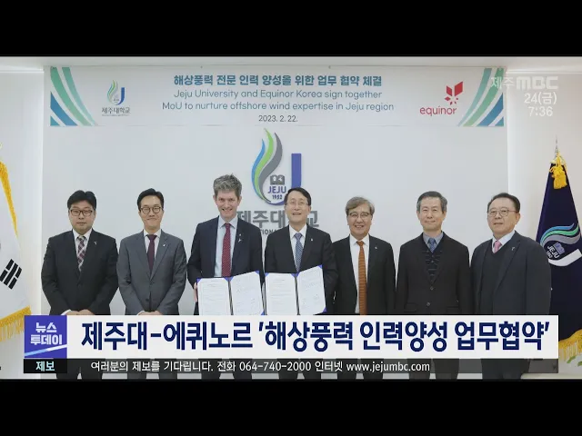 제주대와 노르웨이 국영기업인 에퀴노르 코리아가 해상풍력 전문인력을 양성하기 위한 업무협약을 맺었습니다. 두 기관은 앞으로 제주대에 해상풍력 교과과정과 실습 프로그램을 개설하고 인턴십 등 산학 협력 프로그램을 만들어 해상풍력 분야 교육과 연구 강화를 통한 인력 양성에 협력하게 됩니다.