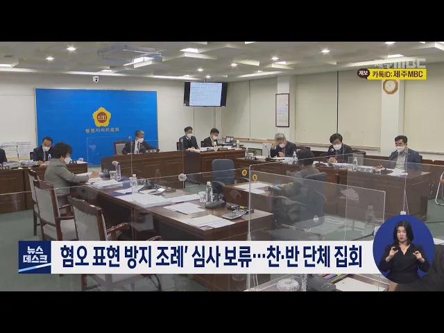 제주도의회 행정자치위원회는 '제주특별자치도 혐오 표현 방지 및 피해자 지원 조례'에 대해 심도 깊은 논의가 필요하다며 심사 보류를 결정했습니다. 심사가 진행되는 동안 도의회 앞에서는 특정 집단에 대한 비하와 혐오 표현을 막기 위해 조례를 제정하라는 찬성 단체와 비하와 혐오 표현의 범위가 추상적이고 역차별이 ...