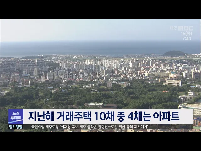 제주에서 지난해 거래된 주택 10채 가운데 4채는 아파트로 나타났습니다. 한국부동산원에 따르면 지난해 제주지역 주택 거래량은 만 6천910호로 재작년보다 17.3% 증가했고, 거래 주택 가운데 39%는 아파트로 조사됐습니다. 한편 주택거래의 71%는 매매로 집계됐으며, 증여는 11.5%로 5년 연속 10%를 웃돌았습니다.