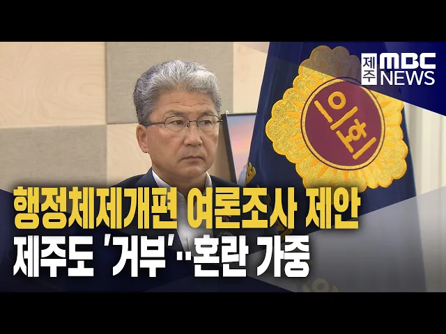 ◀ 앵 커 ▶ 제주형 행정체제개편과 관련해 이상봉 제주도의회 의장이 도민 여론조사를 실시하자고 제안했는데요. 제주도가 사실상 거부 의사를 밝히면서 논란이 일고 있습니다. 홍수현 기자입니다. ◀ 리포트 ▶ 제주형 행정체제개편에 대한 도민 토론과 여론조사를 실시하자고 제안한 이상봉 의장. 제주도 행정체제개편위원회...