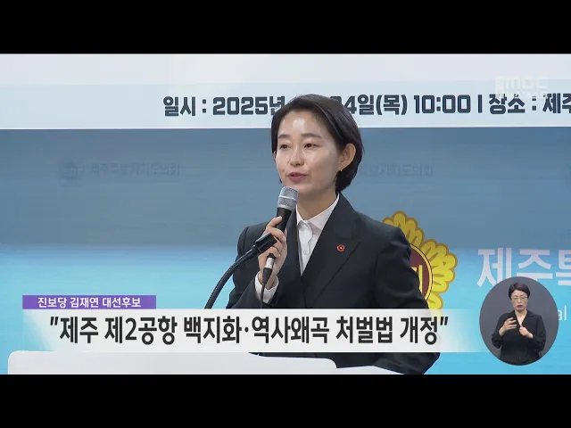 진보당 김재연 대통령 후보가 제주를 방문해 제2공항 전면백지화 등 지역 공약을 내걸었습니다. 김재연 후보는 오늘 오전, 제주도의회에서 기자회견을 열고 제주 제2공항 전면백지화와 4.3 역사왜곡 처벌법 개정의 2대 핵심과제를 제시하고, 제주의 기후위기 대응 국가시범특구 지정 추진 등 3대 정책을 내걸었습니다. 김 ...