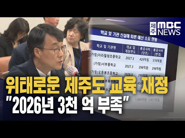 ◀ 앵 커 ▶ 제주도의회 교육위원회 행정사무감사에서는 위태로운 교육재정이 도마에 올랐습니다. 2026년까지 부족한 제주도교육청 예산이 3천억 원에 이를 것으로 예상되는 가운데, 면밀한 예산 지출 계획은 없다는 지적이 쏟아졌습니다. 홍수현 기자가 보도합니다. ◀ 리포트 ▶ 최근 설계안이 공개된 가칭 제주서부중학교. ...