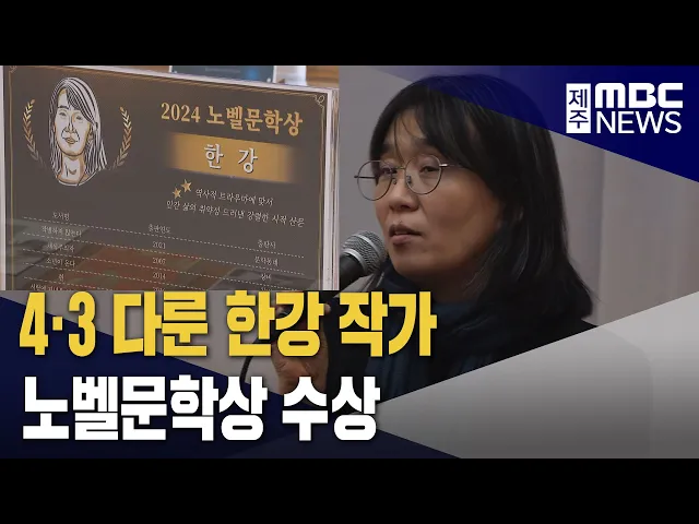 ◀ 앵 커 ▶ 한국문학의 큰 경사인 한강 작가의 노벨문학상 수상 소식에 제주에서도 축하와 환영이 이어졌습니다. 특히 4.3을 다룬 소설 '작별하지 않는다'로 제주의 아픔을 세계에 알린 그녀의 수상은 제주도민들에게 큰 의미로 다가오고 있습니다. 홍수현 기자입니다. 한국을 넘어 아시아 여성 최초로 노벨문학상 수상자에 ...