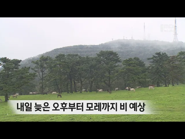 휴일인 오늘 제주지방은 오후들며 흐리고 낮 최고기온이 제주시 26도, 서귀포 26.3 등의 분포를 보였습니다. 월요일인 내일은 대체로 흐리고 늦은 오후부터 비가 오겠습니다. 예상강수량은 모레 늦은 오후까지 10에서 60밀리미터로, 낮 기온은 오늘과 비슷하겠습니다. 제주지방은 목요일 오후와 금요일에도 비가 올 것...