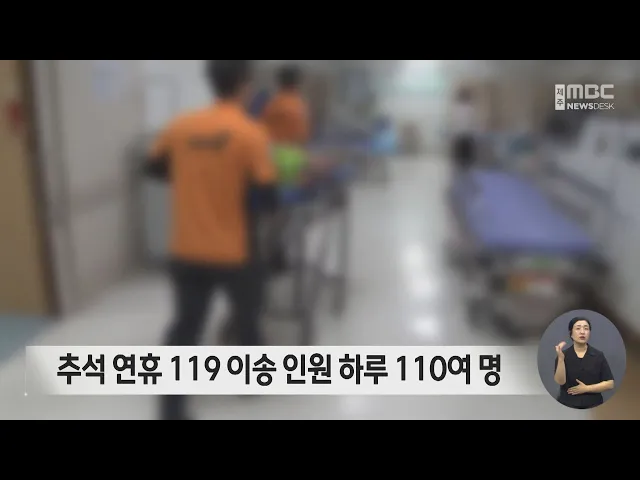추석 연휴에 119 이송 인원이 하루 110여 명에 이르는 것으로 나타났습니다. 제주도 소방안전본부에 따르면 최근 3년 동안 추석 연휴 구급 활동은 872건이고, 하루 평균 119 이송한 인원은 115명으로 집계됐습니다. 소방본부는 모레(19일) 오전 9시까지 추석 연휴 119 구급대책을 추진 중인 가운데, 응급 질환 상담과 이...