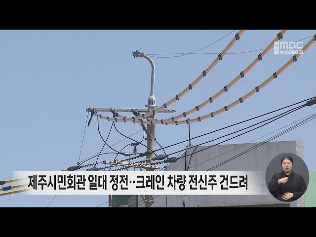 오늘 오전 제주시민회관 일대에서 정전사고가 나, 주민들이 불편을 겪었습니다. 오늘 오전 11시 16분쯤 제주시 이도1동 제주시민회관 부근 한 신축공사 현장에서 크레인 차량이 전신주를 건드려 20여 분간 일대 전기 공급이 끊기는 사고가 발생했습니다. 한전 측은 전력 복구팀을 보내 오전 11시 39분에 전기공급을 재개...