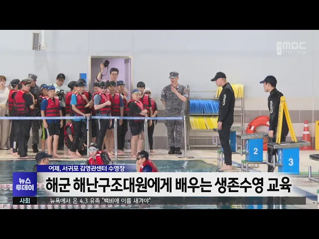 전국에서 처음으로 해군 해난구조대원과 함께하는초등학교 생존수영 교육이 진행됐습니다. 서귀포시교육지원청과 해군 제7기동전단은 기동전단 안에 있는 김영관센터 수영장에서 해군 해난구조대 SSU대원의 지도로 강정초 5학년과 6학년 학생 18명에게해상 조난에 대비한 수영을 가르쳤습니다. 이번 교육은 실제 상황을 가...