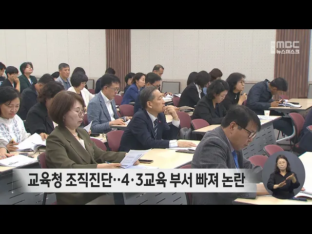 제주도교육청 조직개편을 앞두고 조직진단 연구용역 최종안이 제시된 가운데, 4·3교육 부서가 빠져 논란이 일고 있습니다. 제주도교육청이 공개한 조직진단 연구용역 최종보고 자료에 따르면, 민주시민교육과를 폐지해 업무와 기능을 이전하는 안이 제시됐습니다. 하지만 주요 업무 가운데 하나인 제주4.3과 역사 교육을 어...