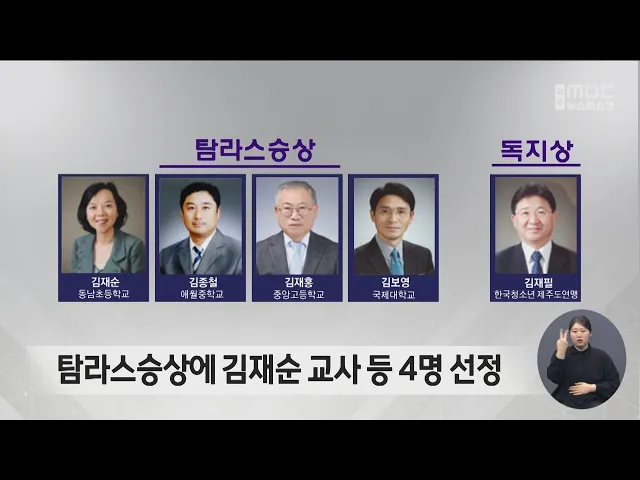 2024 탐라스승상 수상자에 동남초 김재순 교사와 제주국제대 김보영 교수 등 4명이 선정됐습니다. 탐라스승상은 제주도교원단체총연합회가 2003년부터 제주 교육 발전에 공헌한 스승을 발굴해 해마다 시상하는 상입니다. 독지가상에는 교육 발전에 적극적인 협조와 지원을 이어온 한국청소년 제주도연맹의 김재필 자문위원...