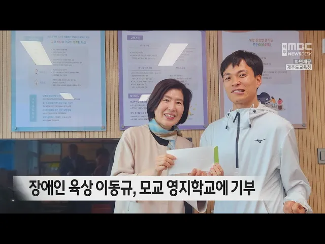 제주도 장애인체육회 소속인 육상 선수 이동규 씨가 장애인의 날을 맞아 모교인 제주영지학교에 학교발전기금으로 100만 원을 기탁했습니다. 이동규 선수는 학창 시절 받았던 지원과 격려가 큰 도움이 됐다며, 후배들이 더 좋은 환경에서 성장할 수 있기를 바란다고 전했습니다.