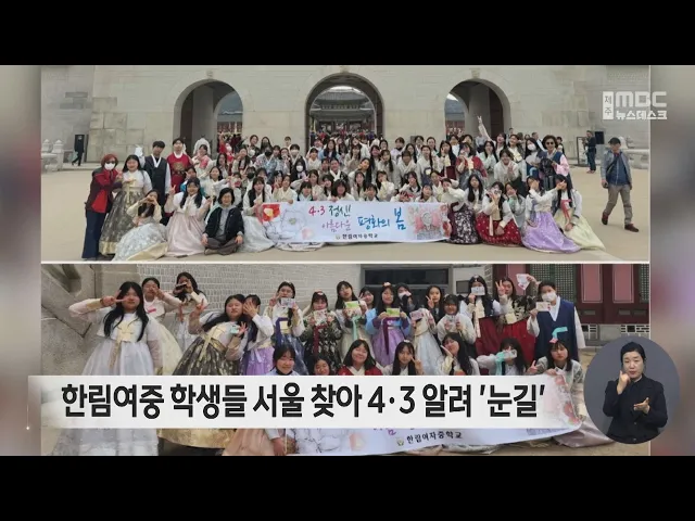 제주의 한 중학교 학생들이 서울에서 4.3을 알리는 행사를 마련해 눈길을 끌었습니다. 한림여자중학교 2학년 학생과 교사 등 70여 명은 도외 체험학습으로 서울 광화문과 경복궁을 찾아 국내외 관람객들에게 제주 4.3을 알리는 엽서를 전달했습니다. 학생들이 배부한 엽서는 학생자치회 공모전을 열어 선정한 작품으로 한글...