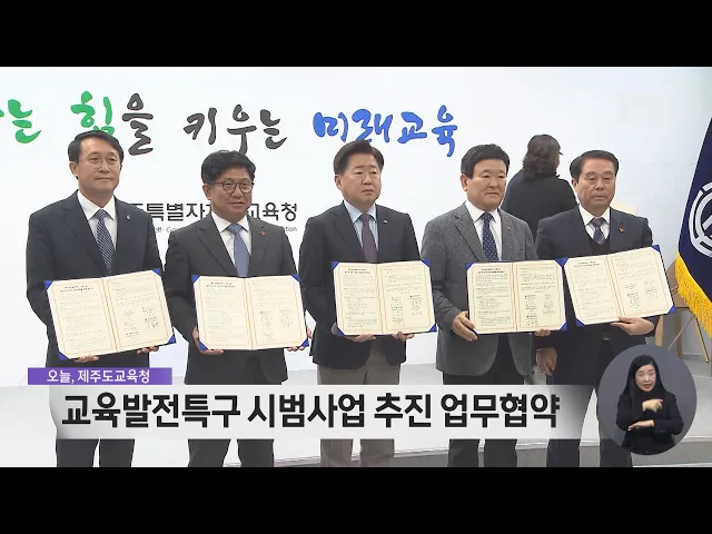 정부가 추진하는교육발전특구 시범지역에 선정되기 위해도내 기관들이 업무협약을 맺었습니다. 제주도와 도의회, 제주도교육청과 제주대, JDC 등은교육발전특구 시범사업 추진을 위한 업무협약을 맺고, 특구 운영기획과 지역인재 양성, 공교육 지원과 정주여건 개선 등 분야별 전략을 협력해 마련하기로 했습니다. 교육발...