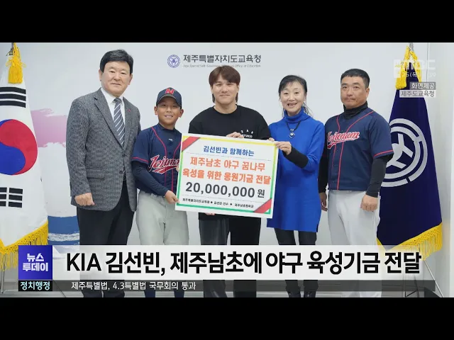 프로야구 KIA타이거즈 김선빈이제주남초등학교를 찾아 야구 꿈나무 육성을 위한 응원기금으로써달라며 2천만 원을 기탁했습니다.김선빈 선수는 제주남초 야구부 주장과 학부모 대표,김광수 교육감 등이 참석한 기금 전달식에서어려운 여건 속에서도 꾸준히 연습해멋진 야구 선수가 되기를 바란다고말했습니다.광주출신인 김...
