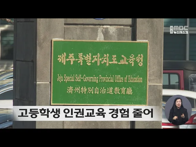 도내 고등학교에서 이뤄지는 인권교육이 줄었다는 조사 결과가 나왔습니다. 제주도교육청 학생인권교육센터가 지난 달 도내 학생과 교직원 등3천여 명을 대상으로 조사한 결과,1년 안에 학교에서 인권 관련 교육이나연수를 받았다는 응답은고등학생이 52.5%, 중학생 63.9%, 초등학생이 79.6%로 집계됐습니다. 고교생들의 인...