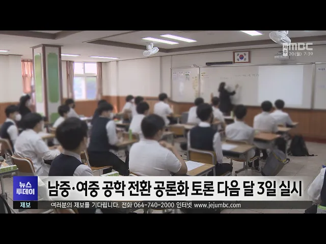 제주지역 남자중, 여자중학교의공학 전환에 대한 도민 의견을 듣기 위한공론화 토론이 실시됩니다. 제주도교육청은 제주지역 단성중학교의 남녀공학 전환에 대한도민여론조사를 진행 중인 가운데,다음 달 3일 오후, 한라대 컨벤션홀에서 도민참여단 공론화 토론을실시할 예정입니다. 도민참여단은여론조사를 통해 무작위로...