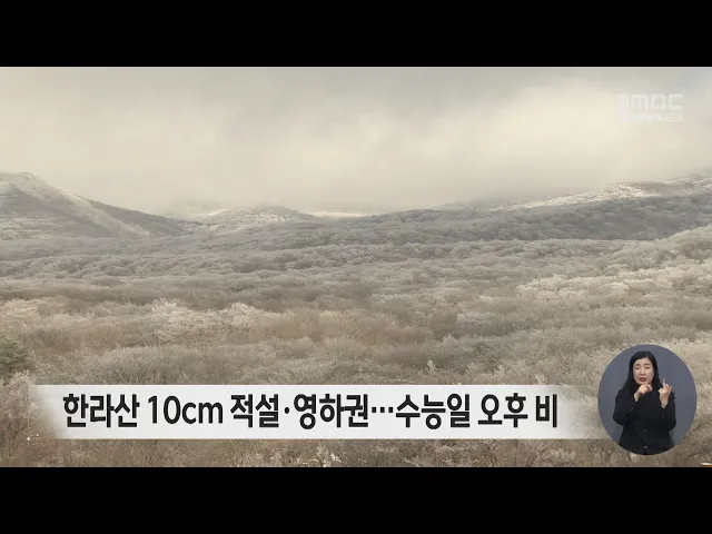 오늘 제주는 북쪽 찬공기의 영향으로한라산에 눈이 내리고 쌀쌀한 날씨가 이어졌습니다. 한라산에는 삼각봉에 10.7cm의 눈이 쌓인 가운데입산이 전면 통제됐고, 윗세오름의 낮 최고기온이 영하 3.7도, 해안지역도 10도 안팎에 머물렀습니다. 제주는 내일(14일) 낮부터 기온이 올라모레는 평년과 비슷하겠지만,수능시험일인 ...