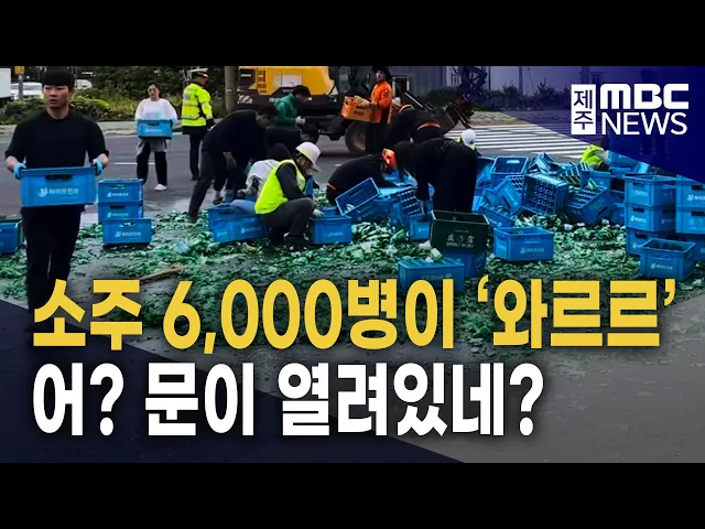 ◀ 앵 커 ▶ 제주시내 한 도로를 달리던 주류 운반차량에서 소주 수천 병이 도로로 쏟아졌습니다. 적재함 문이 제대로 잠기지 않아 사고가 난 것으로 보이는데,소방대원과 경찰뿐만 아니라 시민들까지 빗자루를 들고 청소에 나섰습니다. 홍수현 기자입니다. 제주시내 왕복 6차로의 한 사거리. 주류 운반차량 한 대가적재함이 ...