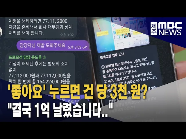 ◀ 앵 커 ▶ 최근 온라인에서도 다양한 유형의 사기가 등장하고 있는데요. 쇼핑몰에서 '좋아요'를 누르는 부업이라고 속인 뒤, 입금을 유도하는 사기가 제주에서도 잇따르고 있어 경찰이 수사에 나섰습니다. 이따끔 기자가 보도합니다. ◀ 리포트 ▶ [ CG ] "임시 파트 타임 채널에 오신 것을 환영합니다." 부업을 광고하는 문...