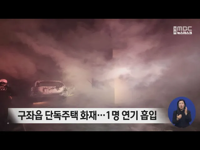 오늘 새벽 5시쯤 제주시 구좌읍의 단독주택에서 불이 나 집안에 있던 60대 여성 1명이 연기를 마셔 병원으로 이송됐고, 주택 50제곱미터와 차량 1대가 불에 탔습니다. 소방당국은 정확한 화재 원인과 피해 규모를 조사하고 있습니다.