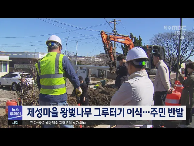 제주시가 도로 확장을 위해 제성마을 입구에 마지막 남은 왕벚나무 그루터기를 강제로 옮겨심어 주민들이 반발하고 있습니다. 주민들은 그루터기를 이식하면 자랄 수 없다고 주장했고, 제주참여환경연대도 성명을 내고 옮겨심지 않겠다는 강병삼 시장의 약속을 지키라고 촉구하는 등 반발이 커지고 있습니다.