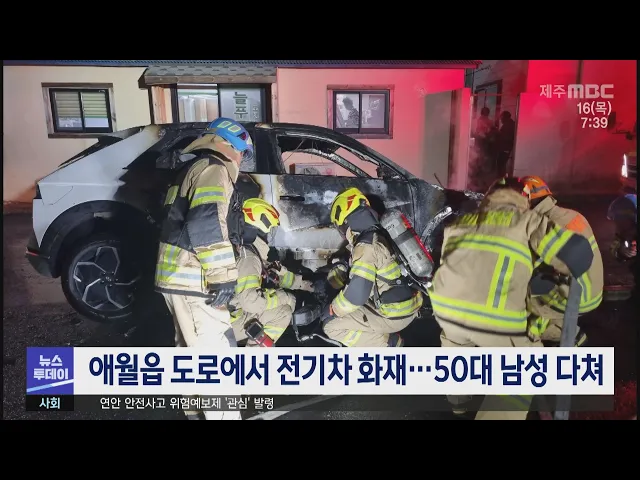 오늘(3/15) 저녁 7시쯤 제주시 애월읍의 한 도로에서 전기차 화재가 발생했습니다. 이 불로 운전자인 50대 남성이 다쳐 병원으로 이송됐고 전기차가 모두 불에 탔습니다. 소방당국은 운전자와 목격자를 상대로 정확한 화재 원인을 조사하는 한편 피해 규모를 파악하고 있습니다.