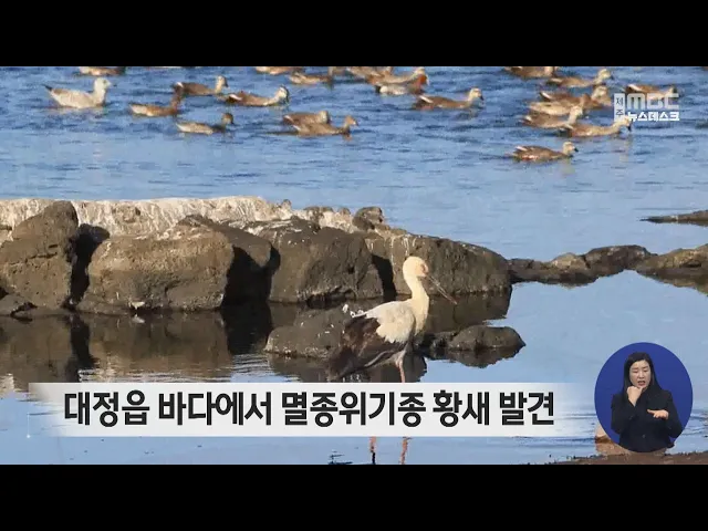 해양환경단체 핫핑크돌핀스는 서귀포시 대정읍 바다 갯바위에서 멸종위기종인 황새 한 마리가 발견됐다고 밝혔습니다. 이들은 황새의 기착지인 제주 연안이 각종 개발로 생태환경이 악화되지 않도록 해양생물보호구역으로 지정해야 한다고 촉구했습니다.