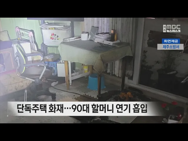 어젯밤 9시 20분쯤 제주시 이도이동의 단독주택에서 불이 나 97살 할머니가 연기를 마셔 병원으로 이송됐고 거실 내부와 전기히터 등이 불에 타 소방서 추산 70만원의 재산피해가 났습니다. 경찰과 소방당국은 전기히터가 넘어지면서 불이 난 것으로 보고 정확한 화재 원인을 조사하고 있습니다.