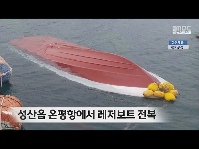 오늘 오후 1시 반쯤 서귀포시 성산읍 온평항에 정박돼있던 레저보트 1대가 전복된 채 발견됐습니다. 배에 사람이 타고 있지 않아 인명피해는 없었는데, 해경은 어제 오후 수리를 마친 뒤 보트를 세워뒀다는 주인의 진술을 바탕으로로 정확한 사고 경위를 조사하고 있습니다.