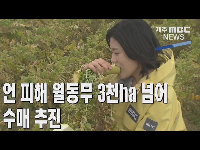 ◀ANC▶ 지난달 말 대설과 한파로 언 피해를 입은 월동무 농가 피해가 급증하고 있는데요, 제주도는 피해를 입은 월동무를 사들여 시장격리하기로 했습니다. 이따끔 기자가 보도합니다. ◀END▶ ◀VCR▶ 제주 월동무 주 산지인 서귀포시 성산읍. 무 밭에 수확하지 못한 월동무가 가득합니다. 얼었던 무 잎은 노랗게 시...