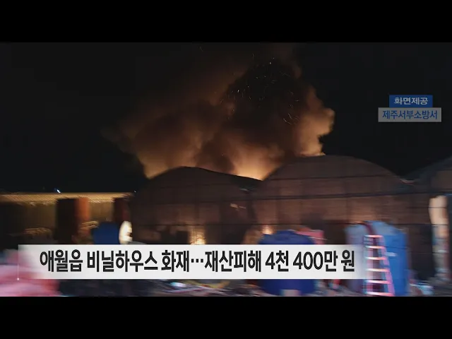 어젯밤 10시쯤 제주시 애월읍의 한 비닐하우스에서 불이 나 330제곱미터의 비닐하우스 1동과 안에 있던 전기 트럭, 냉장고 등을 태워 소방서 추산 4천 400만 원의 재산피해가 났습니다. 경찰과 소방당국은 비닐하우스 안에 있던 전기 트럭 배터리 충전기가 과열돼 불이 난 것으로 보고 정확한 화재 원인을 조사하고 있습니...