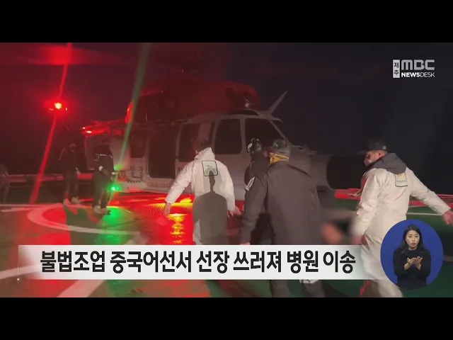 오늘 새벽 5시쯤 서귀포시 대정읍 마라도 남서쪽 128km 해상에서 조업하던 중국어선에서 40대 선장이 쓰러져 헬기로 병원에 이송됐습니다. 선장은 생명에 지장은 없는 것으로 전해졌으며, 해경은 불법조업 혐의로 적발된 해당 어선을 화순항으로 압송해 조사하고 있습니다. 또 어제 오후 7시 50분쯤에는 우리측 배타적 경...