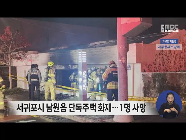 오늘 새벽 2시 20분쯤 서귀포시 남원읍의 한 단독주택에서 불이 나, 집에 있던 50대 여성 1명이 숨지고 여성의 70대 아버지는 대피했습니다. 또 주택 내부 72제곱미터가 불에 타 소방서 추산 2천200여만 원의 재산피해가 났습니다. 경찰과 소방당국은 정확한 화재 원인과 사망 경위를 조사하고 있습니다.