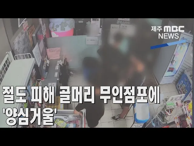 ◀ANC▶ 최근 아이스크림이나 밀키트 같은 상품을 소비자가 고르고 직접 계산해 구매하는 무인점포가 빠르게 늘고 있습니다. 하지만 관리 직원이 없다보니 절도의 표적이 되고 있는데요, 경찰이 이들 매장에 양심거울을 설치했더니 피해신고가 50% 넘게 줄었습니다. 이따끔 기자입니다. ◀END▶ ◀VCR▶ 제주시내 한 무...