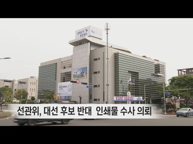 특정 대선 후보를 반대하는 불법 인쇄물이 게시돼 선관위가 수사를 의뢰했습니다. 제주도선거관리위원회는 지난 23일부터 이틀 동안 제주시내 버스정류장 등 6곳에 특정 후보자를 반대하는 내용의 불법 인쇄물 9개가 나붙어 경찰에 수사 의뢰했다고 밝혔습니다. 도 선관위는 제21대 대통령선거와 관련해 현재까지 선거벽...