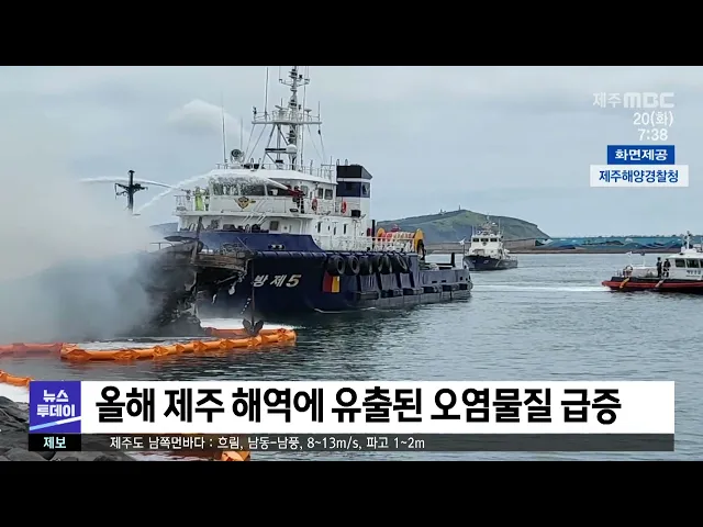 올해 제주 해역에 유출된 오염물질이 크게 늘었습니다. 제주해양경찰청에 따르면 올들어 제주 해역에 유출된 오염물질은 119킬로리터로 지난해보다 50배 가까이 늘었습니다. 해경은 도내 항포구에서 선박 화재가 잇따르면서 유출된 기름이 크게 늘었다며 해양오염사고 방제능력을 강화하겠다고 밝혔습니다.