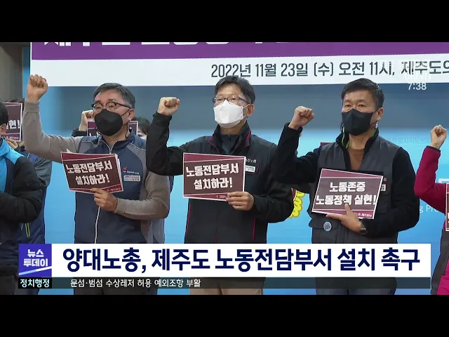 민주노총 제주본부는 제주지역 임금 노동자는 30만명에 이르지만 제주도청의 노동정책 담당인원은 3명에 불과하다며 노동전담부서를 설치해달라는 의견서를 제주도에 제출했습니다. 한국노총 제주본부도 성명을 통해 제주도 조직개편안에 노동전담부서가 빠진 것은 오영훈 지사가 후보 시절 체결한 협약을 파기하는 행위라...