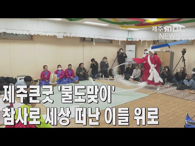 ◀ANC▶ 제주 무속의례 가운데 가장 규모가 큰 '제주큰굿'은 지난해 국가무형문화재로 지정됐는데요, 아이들의 평안을 기원하는 불도맞이 굿이 공개행사로 진행된 가운데 최근 참사로 세상을 떠난 이들의 넋을 위로했습니다. 이따끔 기자입니다. ◀END▶ ◀VCR▶ 심방이 꽹과리 소리에 맞춰 하얀 천을 흔듭니다. 아이를...
