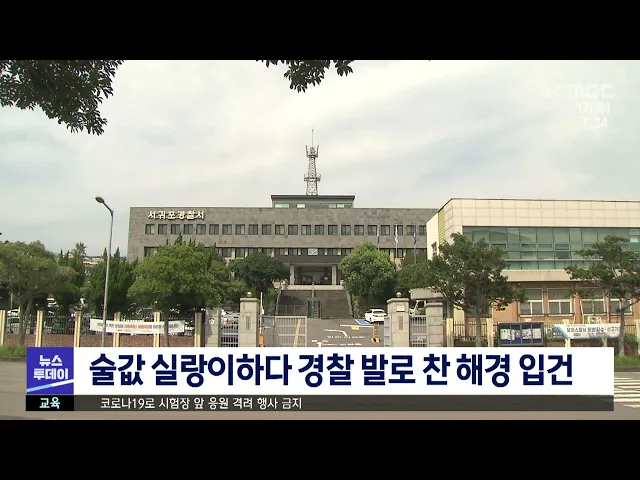 서귀포경찰서는 경찰관을 폭행한 혐의로 서귀포해양경찰서 소속 경위를 입건해 조사하고 있습니다. 해당 경위는 어제(그제) 새벽 3시쯤 서귀포시의 한 술집에서 술을 마신 뒤 술값이 잘못 계산됐다며 업주와 실랑이를 벌이다 출동한 경찰관을 발로 찬 혐의를 받고 있습니다.