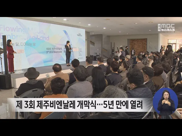 제 3회 제주비엔날레 개막식이 제주도립미술관에서 열렸습니다. 코로나19 여파로 5년 만에 열리는 제주비엔날레는 내일부터 내년 2월 12일까지 도립미술관과 제주현대미술관 등 도내 6개 전시장에서 열리고 16개 나라의 작가 55명의 미술작품 165점이 전시됩니다 또, 국제 큐레이터 토크와 가상현실 체험, 가족 체험 프로...