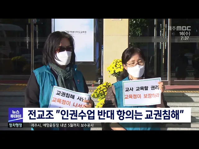 전교조제주지부는 제주도교육청 앞에서 기자회견을 열고 최근 대정중학교의 인권 수업에서 일부 학부모와 단체가 성소수자 표현이 있다며 항의한 것과 관련해 명백한 교권침해라고 주장했습니다. 이들은 교사 천 여명이 교육활동 보호를 위한 서명에 동참했다며. 교육청은 이번 사태에 적극적으로 나서 교사의 수업권을 보...