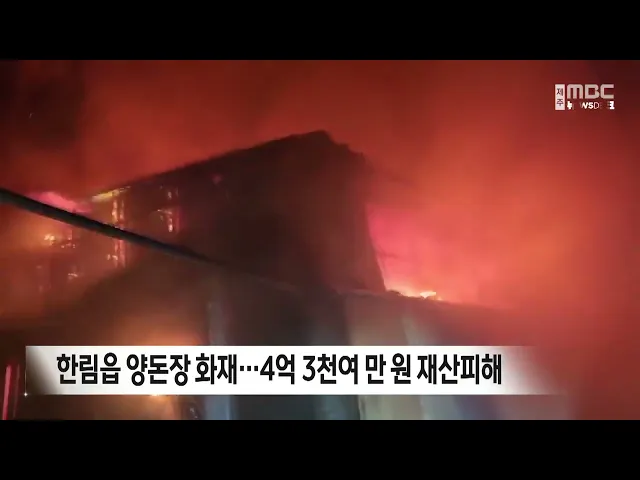 오늘 새벽 5시쯤 제주시 한림읍 금능리 한 양돈장에서 불이 나 돈사 천여 제곱미터를 태우고 돼지 천 백여 마리가 폐사해 소방서 추산 4억 3천 700만 원의 재산피해가 났습니다. 경찰과 소방당국은 국과수에 감식을 의뢰하고 정확한 화재 원인을 조사하고 있습니다.