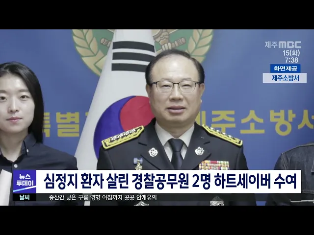 제주소방서는 심폐소생술로 심정지 환자를 살린 삼양지구대 소속 강민욱 경장과 고희정 순경에게 하트세이버 인증패를 수여했습니다. 이들은 지난 3월 삼양지구대 앞에 의식을 잃고 쓰러진 50대 남성을 발견하고 119 구급대가 도착하기 전 심폐소생술을 실시해 구조했습니다.