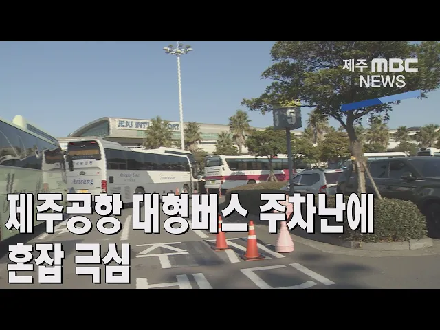 ◀ANC▶ 요즘 제주를 찾는 단체관광객이 크게 늘고 있는데요, 관광객들의 첫 관문인 제주공항이 대형버스 주차난으로 극심한 혼잡을 빚고 있습니다. 이따끔 기자입니다. ◀END▶ ◀VCR▶ 제주공항 주차장 입구. 주차 공간이 가득차 주차장에 들어가지 못한 대형 전세버스들이 줄을 길게 늘어섰습니다. 버스들은 아예 공...