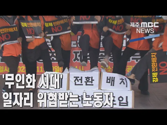◀ANC▶ 디지털 기술의 발달과 비대면 서비스가 확대되면서 제주에서도 무인화 기계를 도입하는 곳이 늘고 있는데요. 무인화의 여파로 일자리를 위협받게 됐다며 노동자들이 곳곳에서 반발하고 있습니다. 이따끔 기자입니다. ◀END▶ ◀VCR▶ 제주공항 주차장 입구의 주차 요금 정산 부스입니다. 지난 주부터 무인 정산...