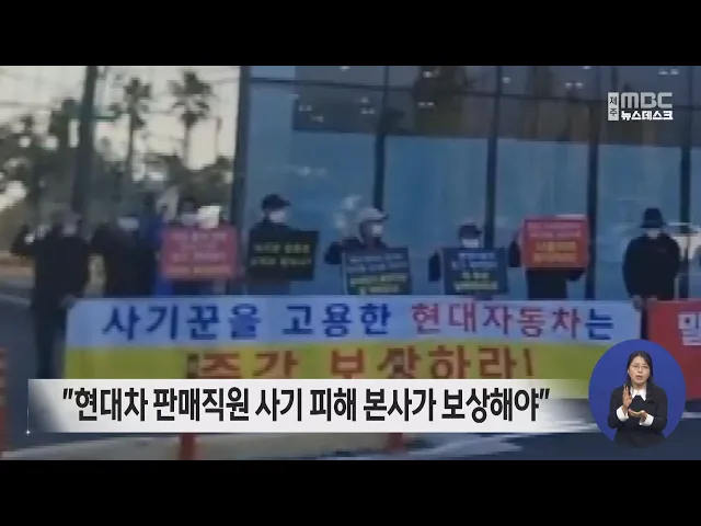 제주지역 현대차 판매직원 사기 피해자 10여 명은 서귀포지점 앞에서 집회를 열고 현대차 본사가 피해를 보상하라고 요구했습니다. 이들은 신차를 빨리 출고해주겠다고 속여 돈을 챙긴 직원이 직영점 소속이어서 본사가 책임을 져야 한다고 주장했는데 지금까지 피해자는 28명에 피해액은 5억 원을 넘는 것으로 추산되고 ...