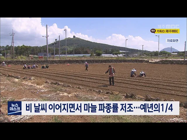최근 태풍의 영향으로 비 날씨가 이어지면서 마늘 농가들이 파종을 하지못해 어려움을 겪고 있습니다. 제주산 마늘은 예년에는 9월 중순에 파종을 마무리했지만 마늘 주산지인 서귀포시 대정읍의 올해 파종률은 25%에 그치고 있습니다. 특히, 제14호 태풍 '난마돌'의 영향으로 다시 많은 비가 내리면 파종 시기가 더 늦어...