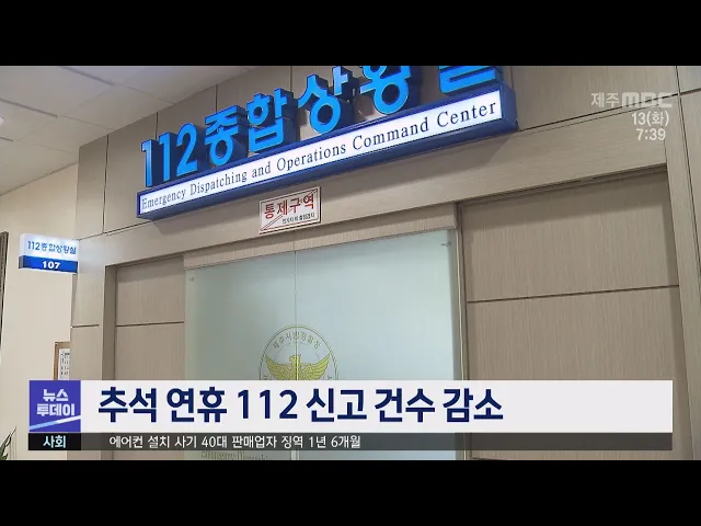 추석 연휴 112 신고 건수가 지난해보다 줄어든 것으로 나타났습니다. 제주경찰청에 따르면 지난 9일부터 나흘 동안 하루 평균 접수된 112 신고는 990건으로, 지난해 추석 연휴 기간 천 18건보다 2.8% 감소했습니다. 112 신고 가운데 범죄 신고는 13% 가까이 증가했지만, 교통사고 발생 건수는 지난해 50건에서 올해 15건으...