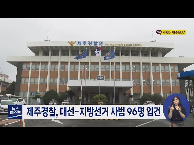 제주경찰청은 올해 대통령 선거와 지방 선거와 관련해 선거사범 96명을 입건했다고 밝혔습니다. 경찰은 대통령 선거와 관련해 선거사범 23명을 입건해 10명을 검찰에 넘겼는데 현수막 벽보 훼손이 12명으로 가장 많았고 금품수수가 4명이었습니다. 또, 지방선거와 관련해서는 73명을 입건해 지금까지 9명을 검찰에 넘겼는데...