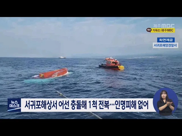 오늘 아침 7시쯤 서귀포항 남동쪽 8.3킬로미터 해상에서 서귀포선적의 4톤급 연안복합어선이 영덕선적 29톤급 근해채낚기 어선과 충돌해 뒤집혔습니다. 이 사고로 4톤 어선에 혼자 타고 있던 선장은 스스로 배에서 탈출해 29톤 어선에 구조됐습니다. 해경은 29톤 어선이 그물을 끌어올리다 4톤 어선을 미처 보지 못해 사고...