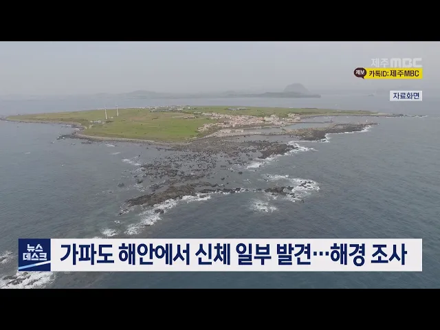 오늘 낮 12시쯤 서귀포시 대정읍 가파도 해안에서 환경정화 활동에 나섰던 학생이 사람의 다리를 발견했다며 해경에 신고했습니다. 해경은 발견된 신체 일부를 수습했지만 다른 유류품은 발견되지 않았고, 신원을 확인하기 위해 국립 과학수사연구원에 DNA 검사를 의뢰했다고 밝혔습니다.